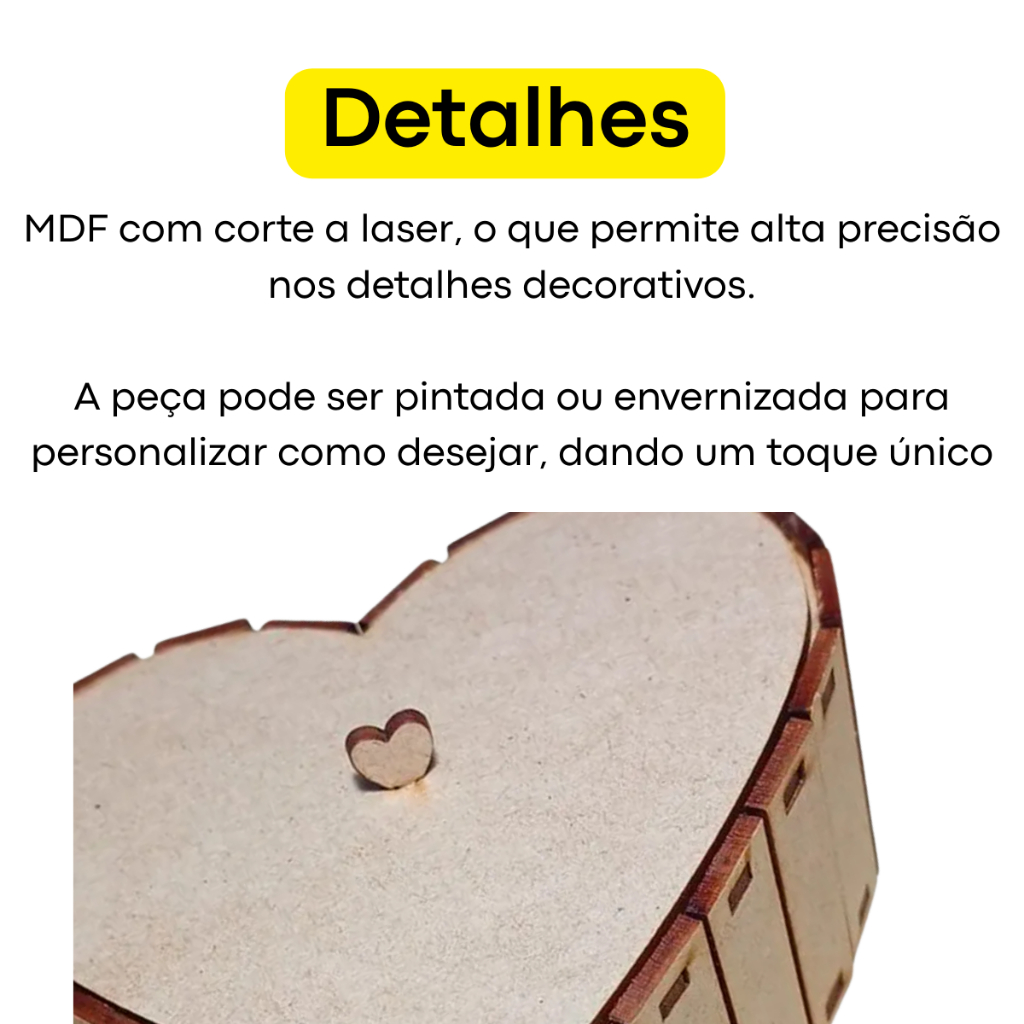 Confeccionado em MDF CRU de qualidade, possui tampa com palavras e desenhos vazados, recortados à laser dando um requinte a mais na embalagem.