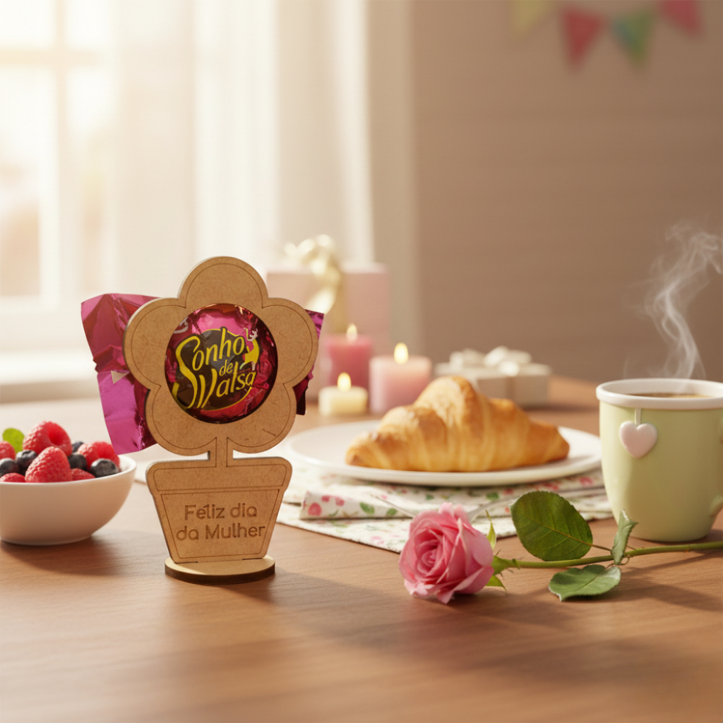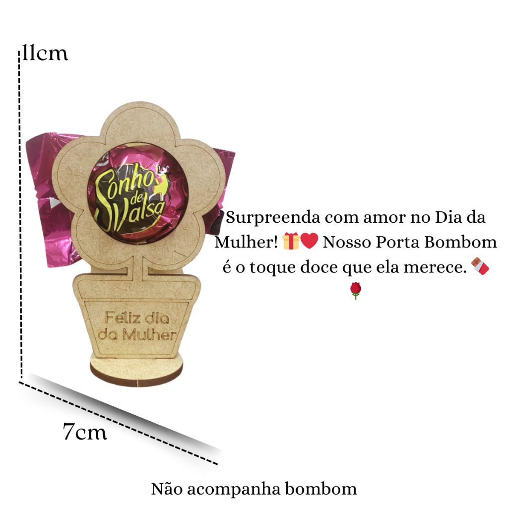 O centro da flor abriga um delicioso bombom, envolto com um toque de sofisticação. A base, que é um vasinho de MDF, traz a mensagem "Feliz Dia da Mulher" gravada com elegância, adicionando um toque personalizado e especial ao presente.