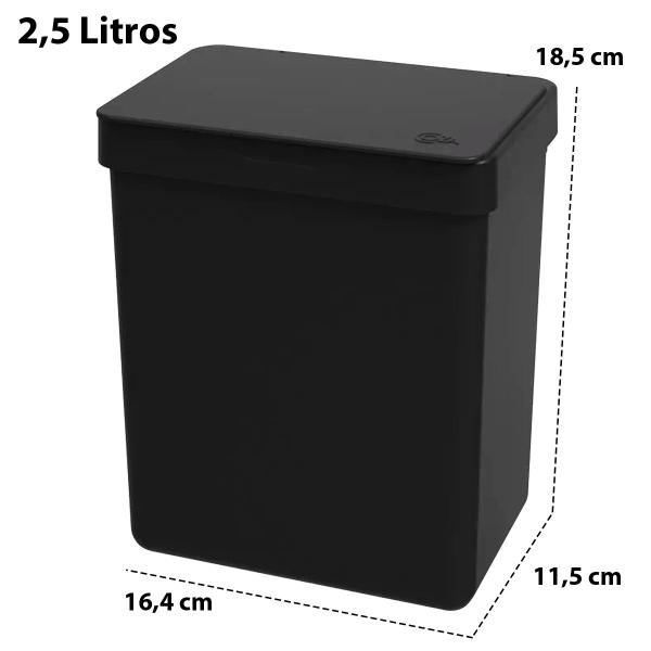 A lixeira com abertura 90o graus, possui capacidade de 2,5 litros e é perfeita para higienização e organização da pia de cozinha.