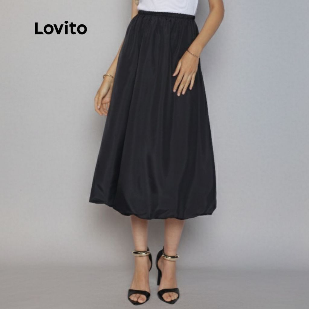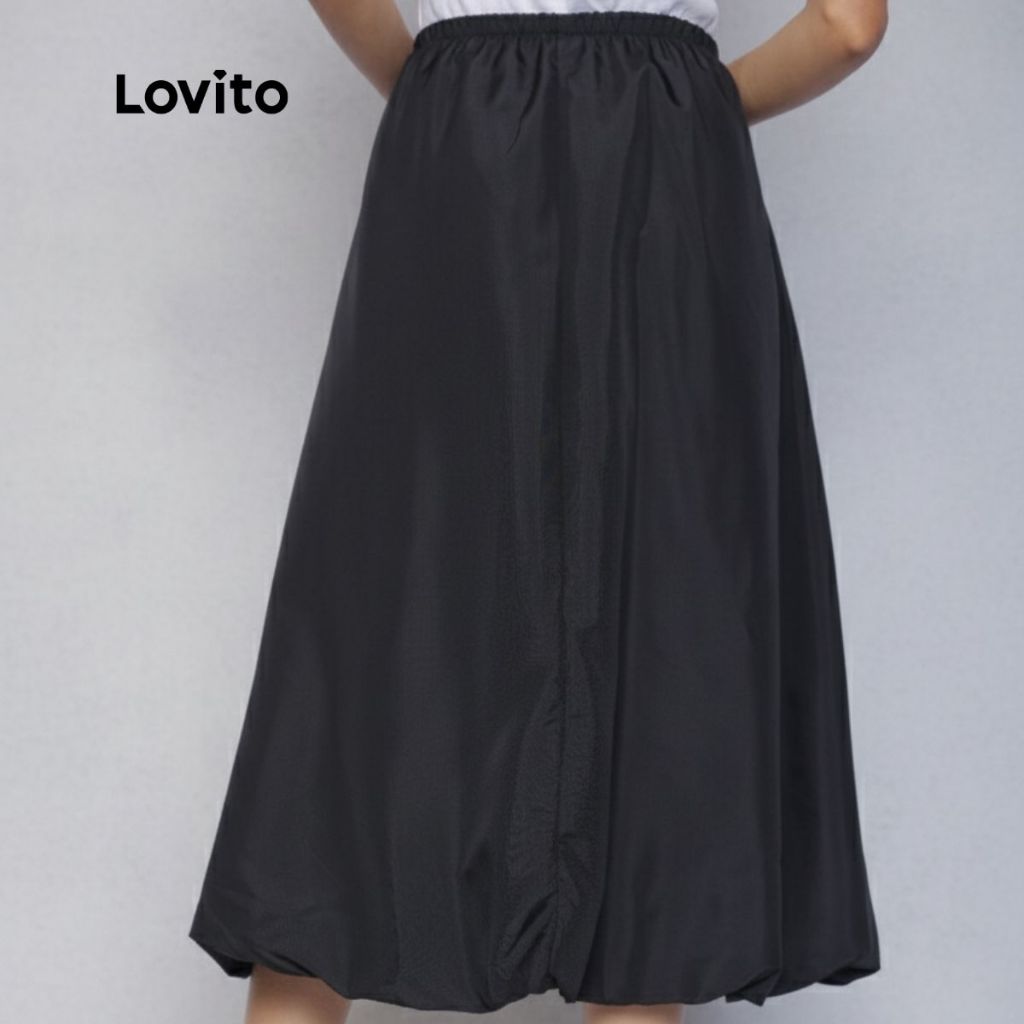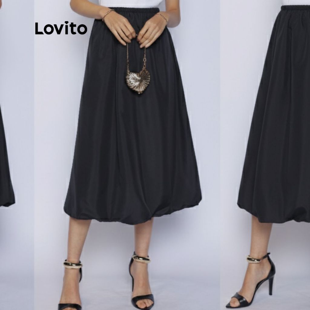Lovito Saia Midi Balone Preta Chique Moda Modesta Feminina LB1259BRL1289