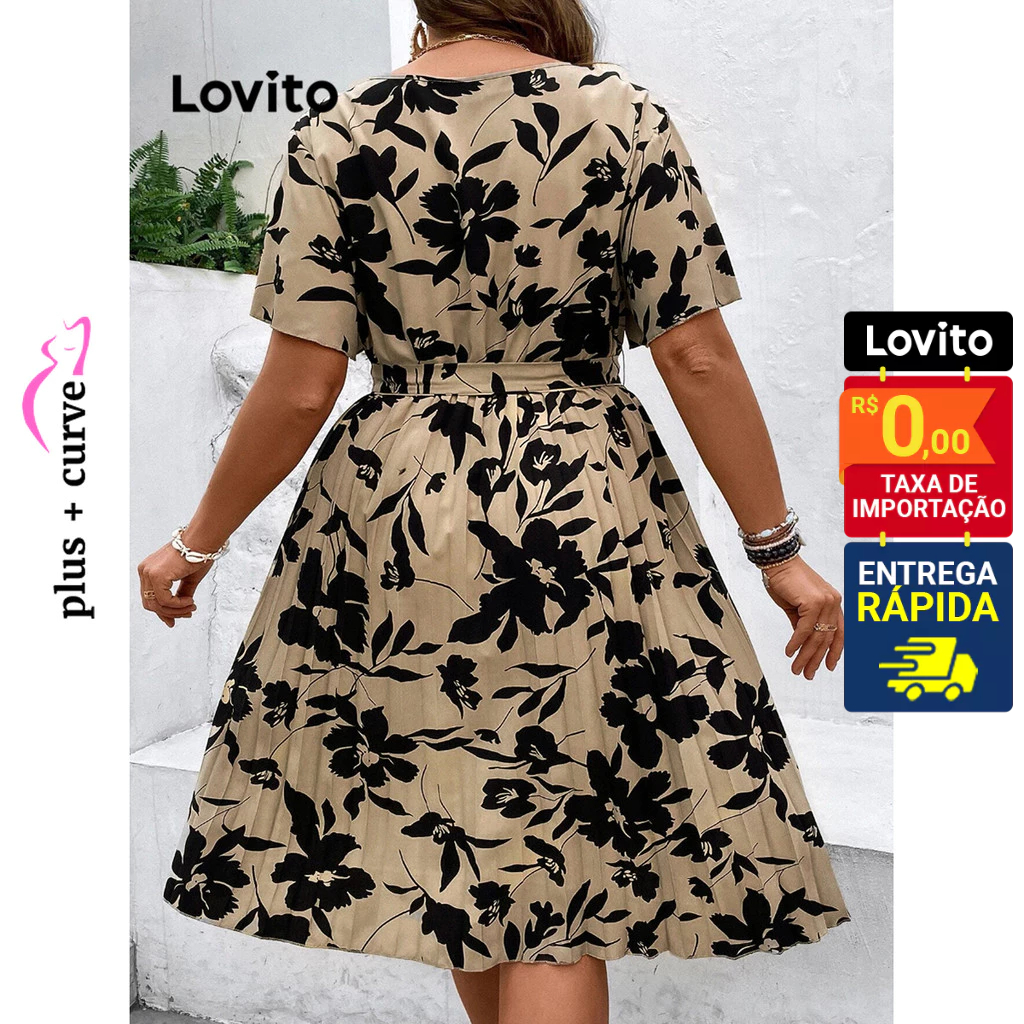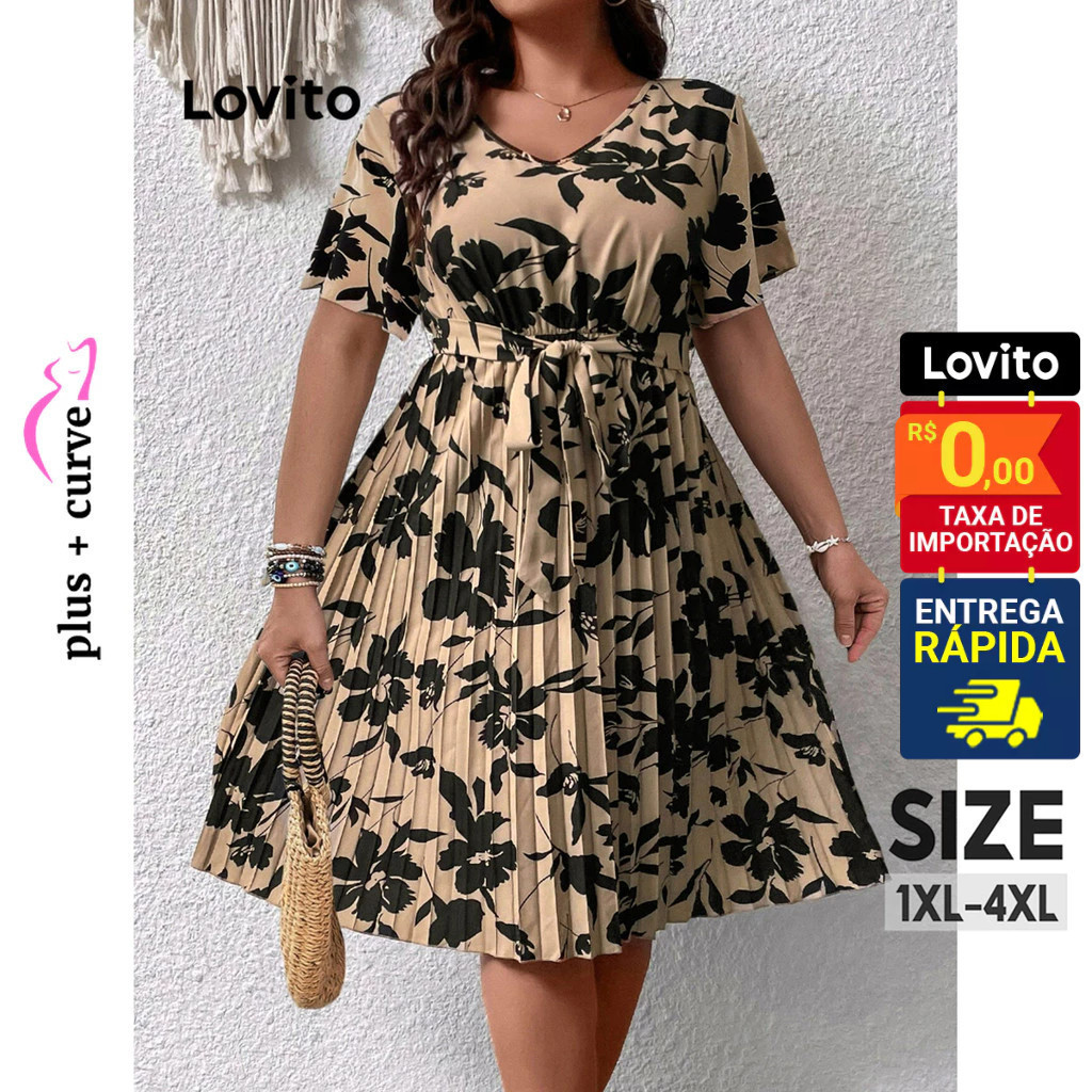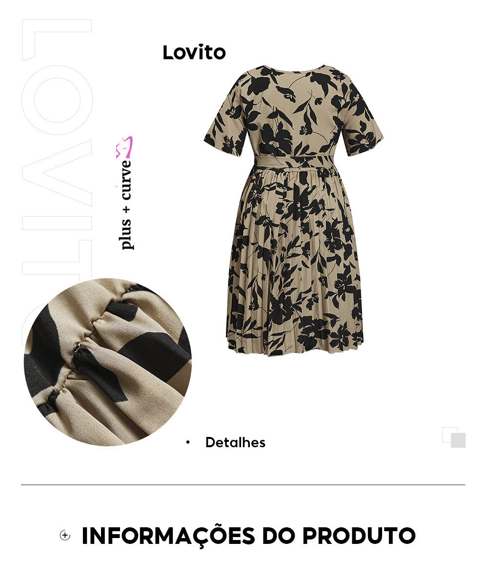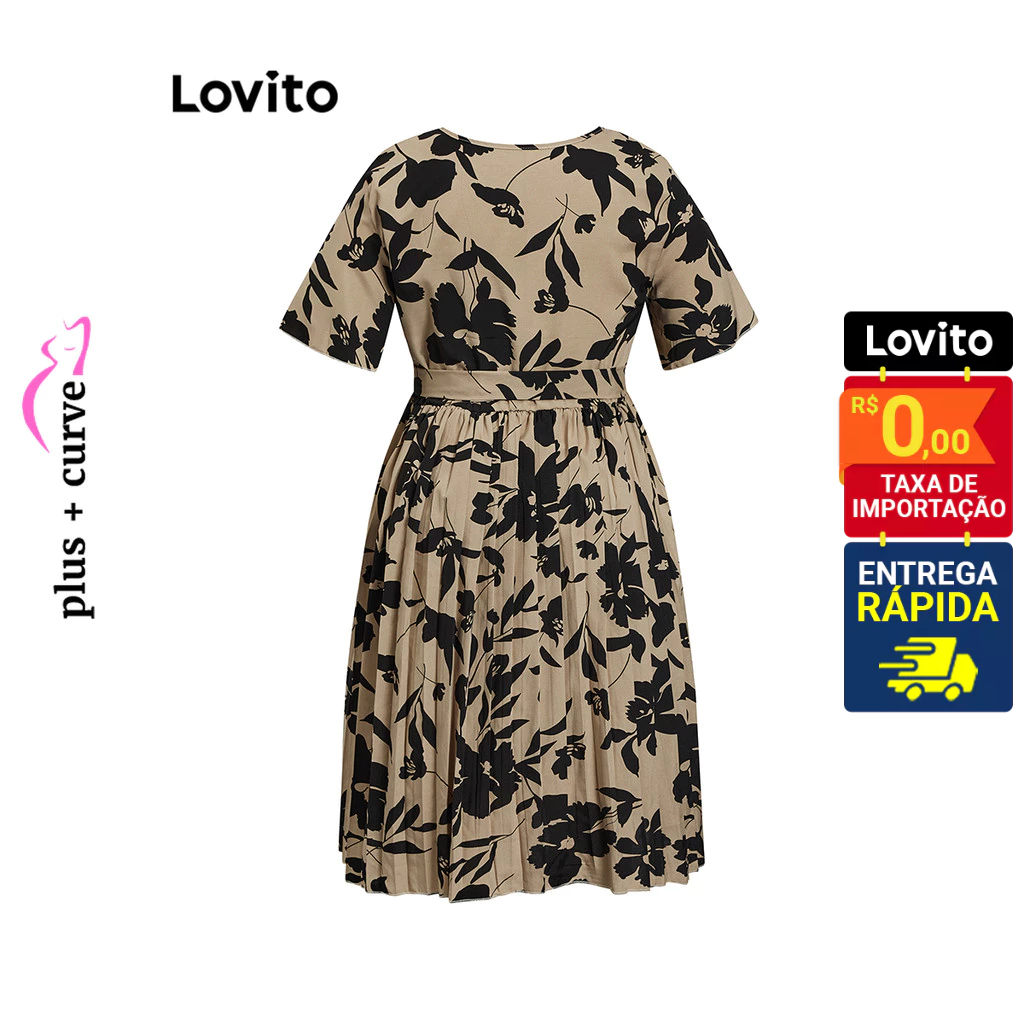 Lovito Vestido Feminino Curto com Amarração na Cintura Plus Size LBL08207