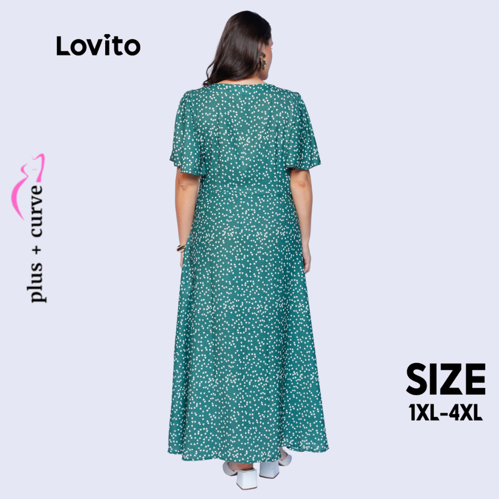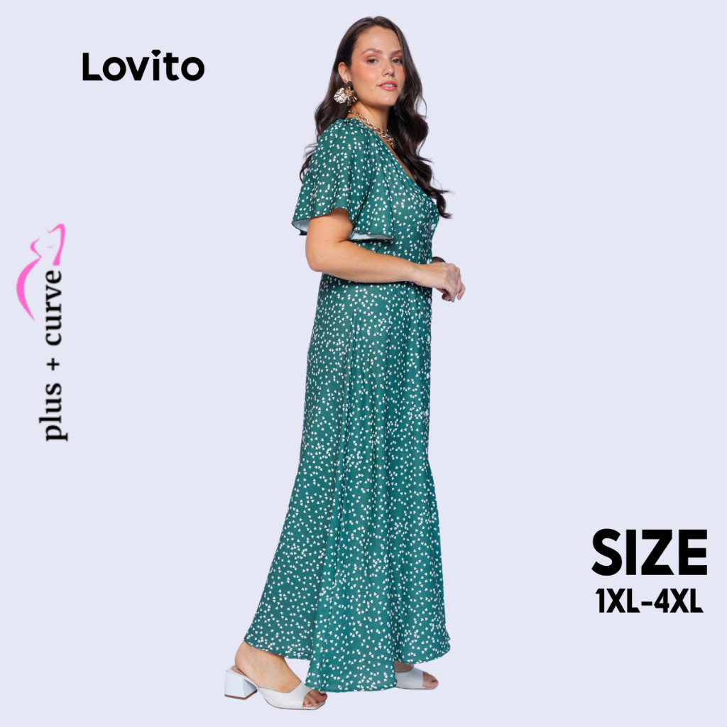 Lovito Vestido Longo Verde Moda Modesta Plus Size Manga Curta Bufante Estampado Feminino LB172BRL201