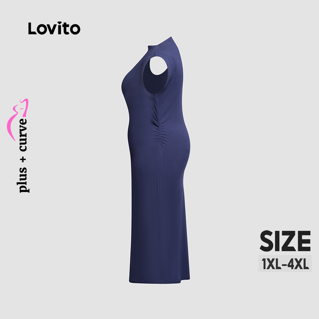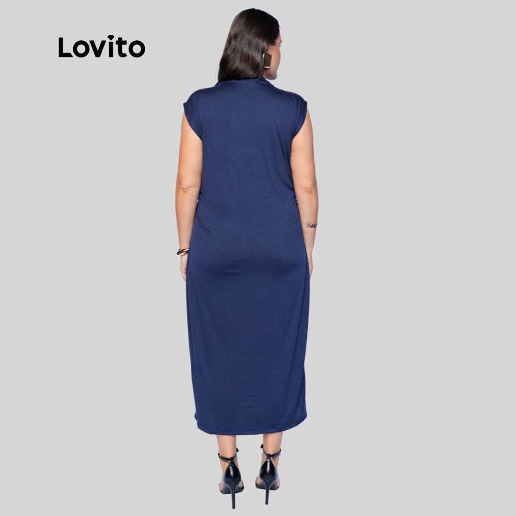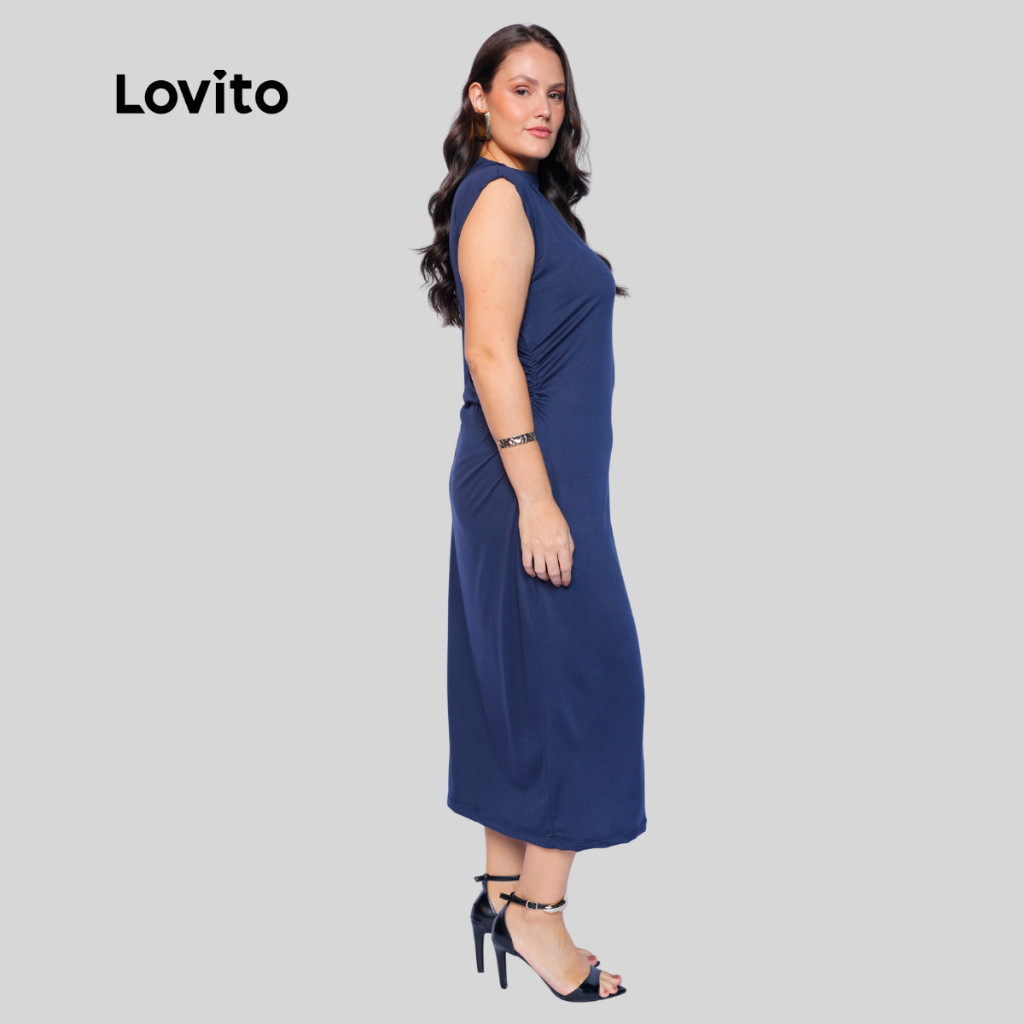 Lovito Vestido Midi Azul Elegante Liso Plus Size Feminino LB1044BRL1074