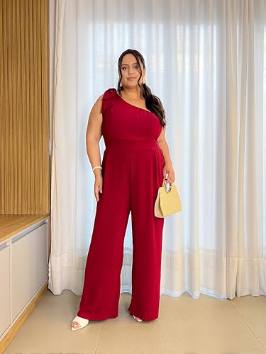 Macacão Feminino Longo Plus Size Pantalona Um Ombro Só com Laço