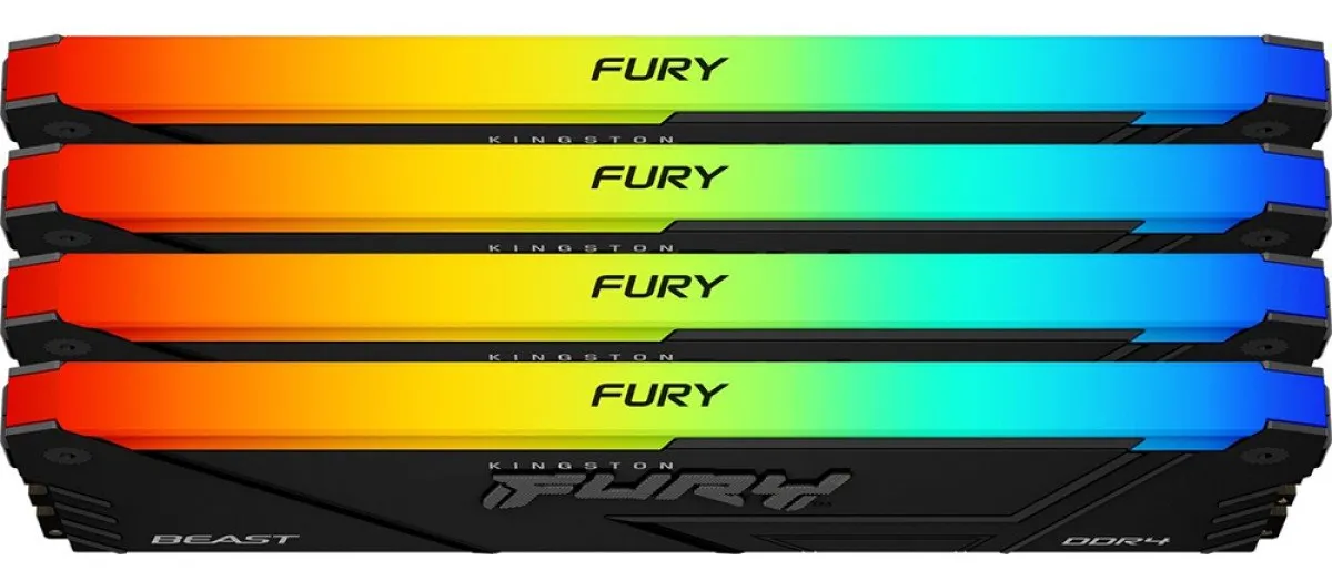 A Kingston FURY™ Beast DDR4 RGB impulsiona sua performance com velocidades de até 3200MHz, estilo desafiador e luzes RGB no comprimento do módulo para efeitos incríveis. Esta atualização potente está disponível na velocidade de 3200MHz, e está pronta para Intel XMP e AMD Ryzen™.