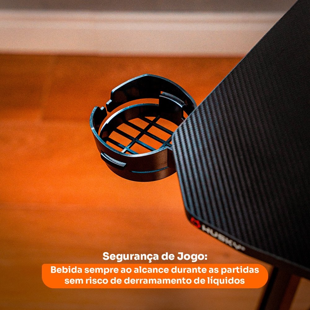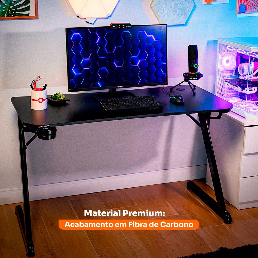 Mesa Gamer Husky Snow, Preto - Superfície em Fibra de Carbono, Suporte para Headset e Copo, Resistente à Umidade - HDG100