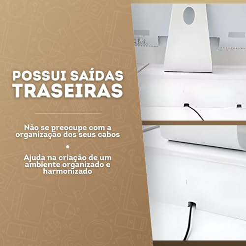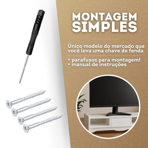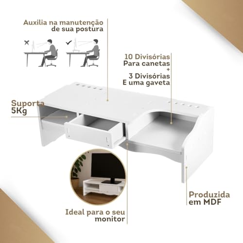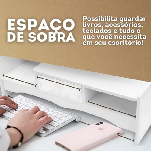 Suporte de Mesa para Monitor de Computador PC MDFEsse suporte de mesa foi projetado para acomodar o monitor do seu computador na altura ideal para evitar problemas de saúde relacionados à ergonomia. Com ele, seu monitor ficará na altura ideal para estimular sempre a postura mais adequada para o usuário. Além de ajudar a proteger sua saúde, este suporte te ajudará a organizar melhor a sua mesa. Além de espaço para guardar o teclado, ele possui prateleiras na base do monitor e no escaninho de apoio que podem ser utilizadas para organizar livros, papeis e objetos de decoração em geral. Especificações técnicas:- 1 suporte elevado com divisória- Medida: 49 cm x 19 cm x 12 cm- Cor: Branco. - Acompanha Parafusos e Chave de Fenda para auxiliar na montagem - Material: MDF. - Acabamento com fechamento e corte com maquinário profissional. - Embalagem segura para que receba seu produto em perfeito estado.