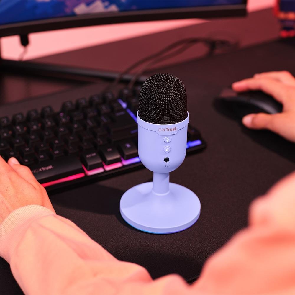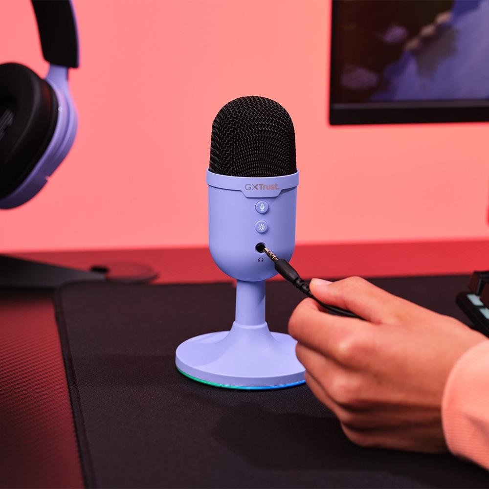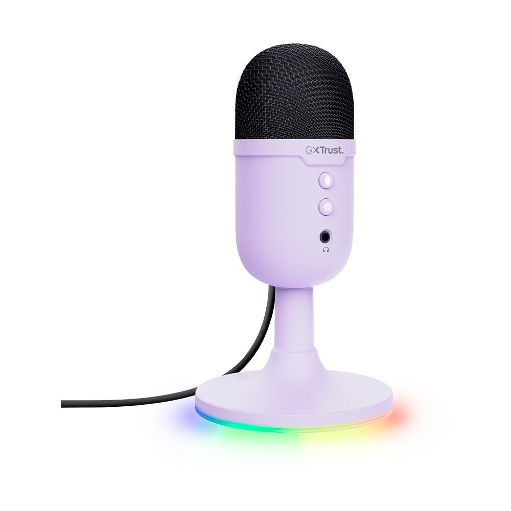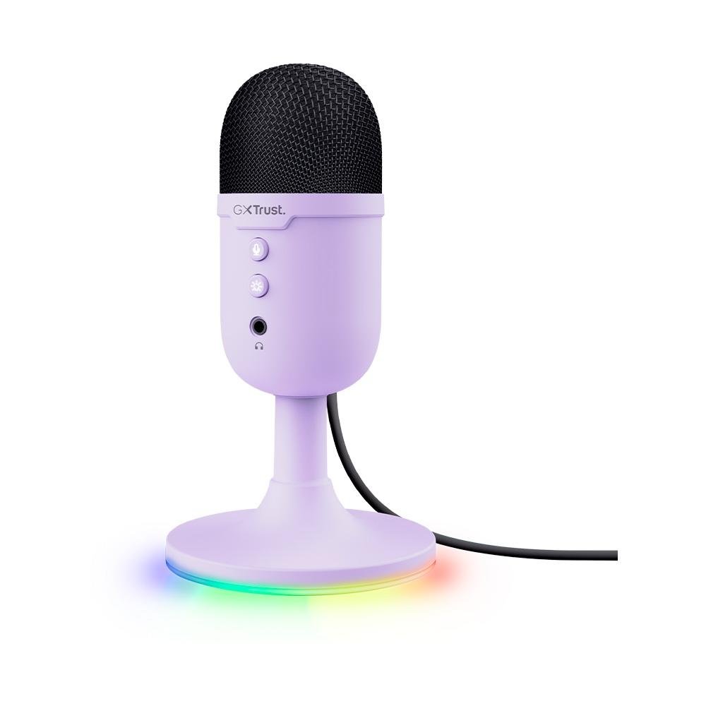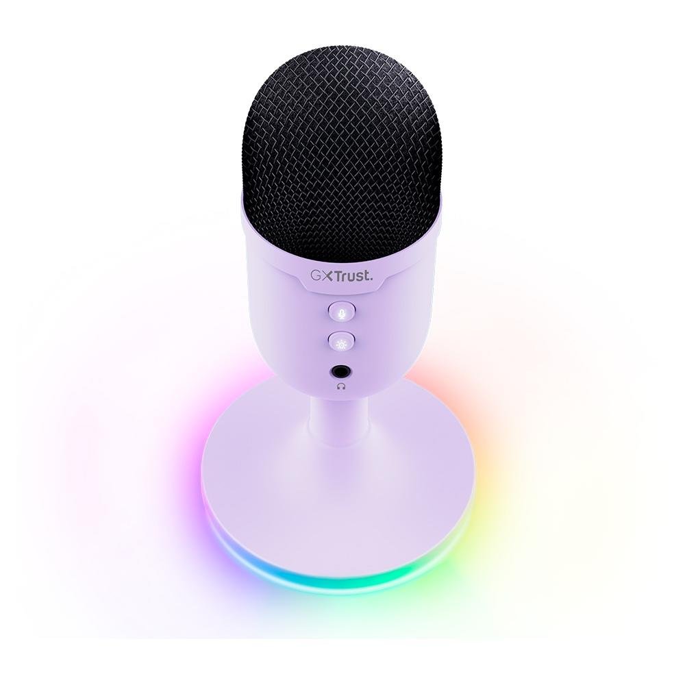 Microfone Gamer GXTrust 234P Yunix, RGB, Compacto, Filtro Pop Integrado, Botão de Mudo, USB, Roxo - 25375