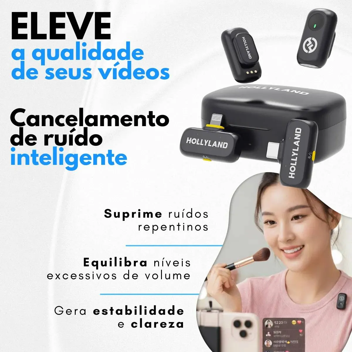 -3 níveis de cancelamento inteligente de ruído: a redução adaptativa de ruído (fraca/média/forte) filtra o vento, o tráfego e os ecos da sala, ideal para usuários de microfones sem fio que filmam ao ar livre, transmissões ao vivo ou podcasts.