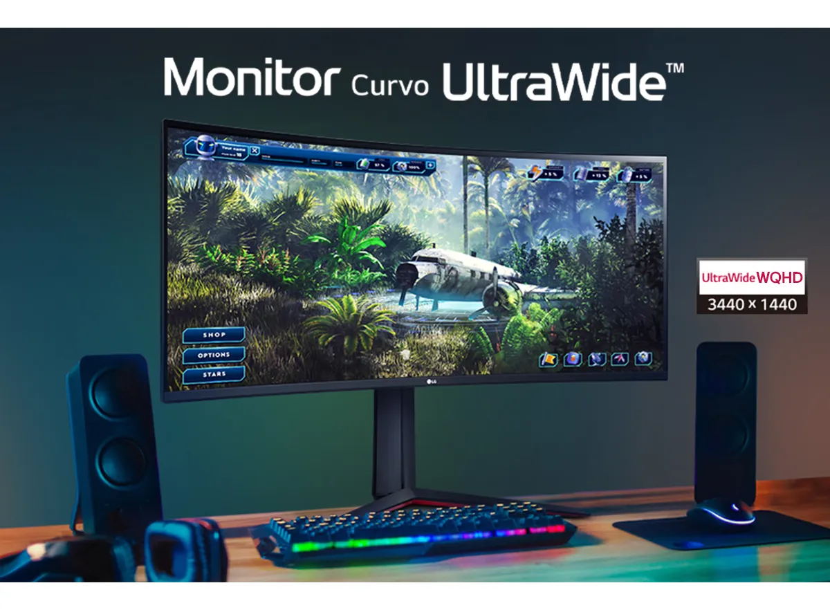 Monitor GamerLG UltragearCurvo –Tela VAde 34”, 2K WQHD 3440 x 1440, UltraWide™ (formato 21:9), 160Hz, 1ms (MBR), AMD FreeSyncPremium –34GP63A-B