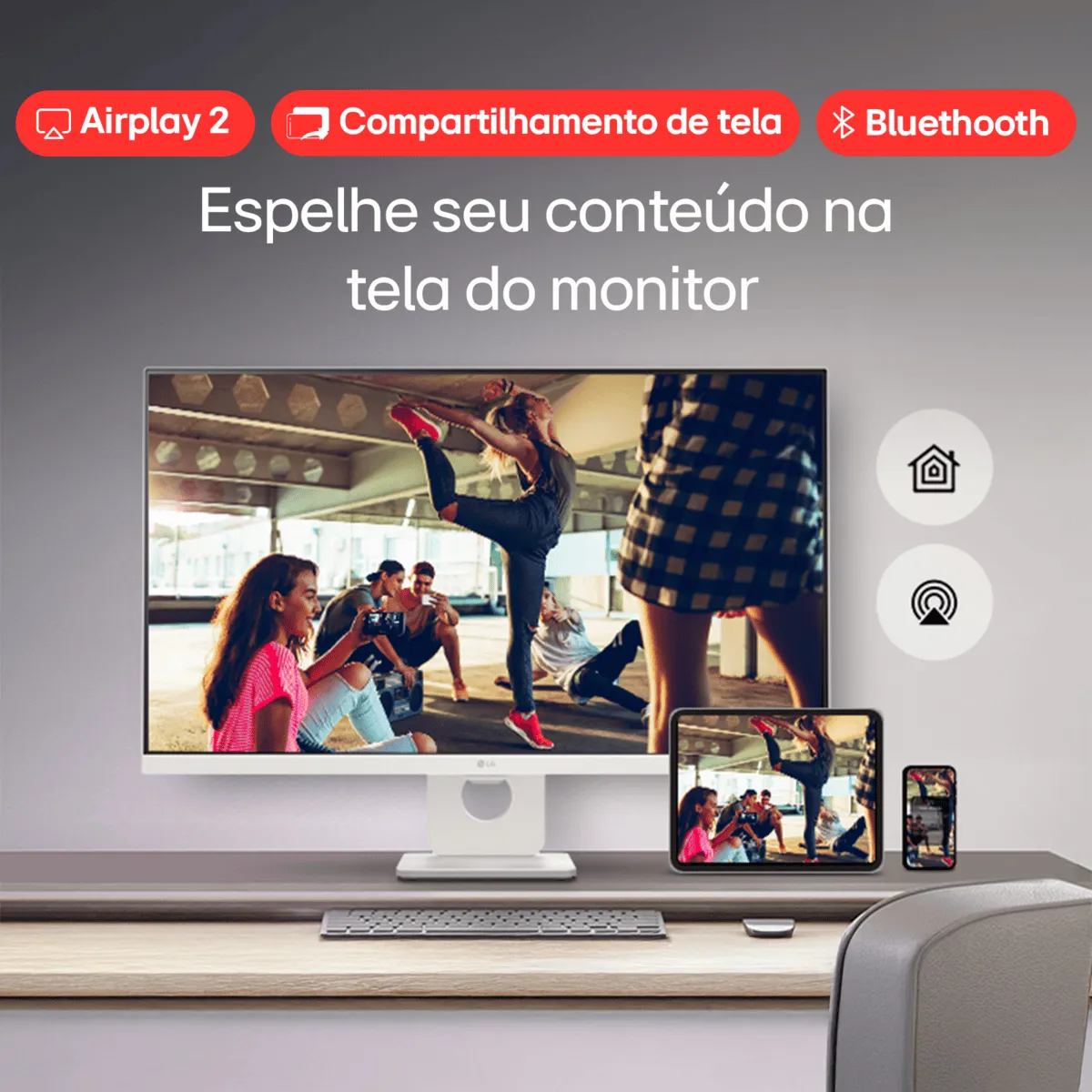• Espelhe seus conteúdos na tela do monitor: Compartilhe o conteúdo do seu smartphone para o seu monitor com AirPlay 2* (para dispositivos Apple) ou Screen Share** (para dispositivos Android). Aproveite também um som envolvente com a conexão Bluetooth e Wi-fi.