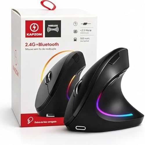 Mouse Ergonômico Sem Fio Vertical Recarregável Silencioso ErgoTech® RGB - Reduz Dor no Pulso e Fadiga – Compatível com Windows, Mac, Notebook, PC – Preto, Design Ortopédico DPI Ajustável