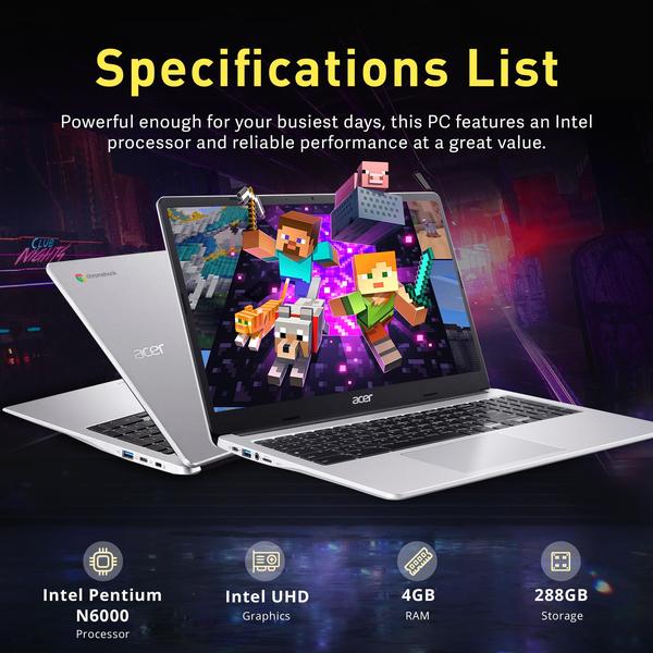Acer Laptop Chromebook 315 de 15,6 polegadas HD, Intel Pentium N6000 - 【Tela HD antirreflexo de 6 polegadas】A tela antirreflexo garante uma visualização confortável, melhorando sua experiência visual ao máximo. Seus negócios e atividades de prazer certamente serão melhorados pela clareza e brilho fascinantes. - 【Processador Intel Pentium N6000】Multitarefas perfeitamente entre materiais de estudo, transmita seu conteúdo de entretenimento favorito e navegue na Internet sem qualquer atraso. Experimente o desempenho Intel com recursos de entretenimento e conectividade rápida. - 【RAM LPDDR4X de 4 GB】Muita largura de banda alta para executar vários programas simultaneamente sem qualquer lentidão. 【Armazenamento de 288 GB】128 GB eMMC + estação de ancoragem 7 em 1 de 128 GB + adaptador de cartão microSD de 32 GB. Oferece velocidade de inicialização incrível e recursos de armazenamento aprimorados. - 【Intel UHD Graphics】Desfrute de cores vibrantes e detalhes nítidos que dão vida ao seu conteúdo diário. 【Webcam HD 720p】Permite fazer chamadas de vídeo de alta qualidade, realizar reuniões virtuais e interagir on-line. - Sistema operacional Chrome】Sistema operacional seguro em nuvem para sua empresa. Dimensões e peso: 14,106 x 24,4 x 2 cm, 1,6 kg. 【Portas】2 USB tipo A, 2 USB tipo C, 1 conector de fone de ouvido, 1 leitor de cartão micro SD, WiFi 6, prata. Conjunto de estação de ancoragem bônus: 1 estação de ancoragem 7 em 1 com armazenamento de 128 GB, 1 cartão microSD de 32 GB com adaptador, 1 cabo de dados tipo C, 1 cabo de carregamento 3 em 1, 1 pano de limpeza de camurça.