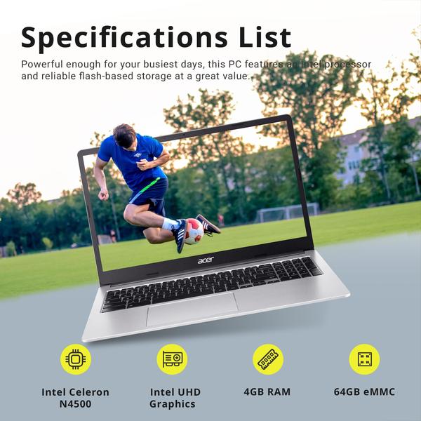 Acer Chromebook Tela IPS Full HD de 15,6 polegadas, Intel Celeron N4500 - 【Tela IPS FHD de 6 polegadas】Com moldura estreita e amplo ângulo de visualização da tela Full HD, você pode desfrutar melhor de filmes, vídeos e programas de TV. Entregue-se a visuais vibrantes com uma tela IPS, apresentando uma resolução de alta definição que mostra cores vivas com clareza notável. - 【Processador Intel Celeron N4500】O design de baixa tensão otimiza o uso de energia, permitindo que você permaneça produtivo e entretido com grande eficiência. Multitarefas perfeitamente entre materiais de estudo, transmita seu conteúdo de entretenimento favorito e navegue na Internet sem problemas, sem qualquer atraso. - 【RAM LPDDR4 de 4 GB】Abundância de RAM de alta largura de banda para executar seus jogos sem problemas, bem como vários programas. 【EMMC de 64 GB】 Salve arquivos rapidamente e armazene mais dados. Com bastante armazenamento e poder de comunicação avançado, ótimo para grandes jogos, vários servidores, backups e muito mais. - 【Gráficos Intel UHD】Desfrute de uma qualidade de imagem sólida que dá vida ao seu conteúdo diário com cores vibrantes e detalhes nítidos. 【Teclado numérico】Funciona confortavelmente com um teclado numérico integrado, com um design responsivo que permite digitação eficiente e maior produtividade. 【Câmera HD 720P】Oferece chamadas de vídeo de alta qualidade, reuniões virtuais e interações online. - 【Chrome OS】Tempos de inicialização rápidos, facilidade de uso, segurança resistente e uma longa vida útil da bateria são algumas das vantagens do Chrome OS. Dimensões e peso: 14 x 24 x 2 cm, 1,6 kg. Portas e compartimentos: 2 USB-C, 2 USB 3.2 geração 1, 1 fone de ouvido/alto-falante; 1 cartão SD, compartimento de segurança Kensington; Wi-Fi 6 e Bluetooth. Prata. Cartão USB Hotface de 128 GB bônus.