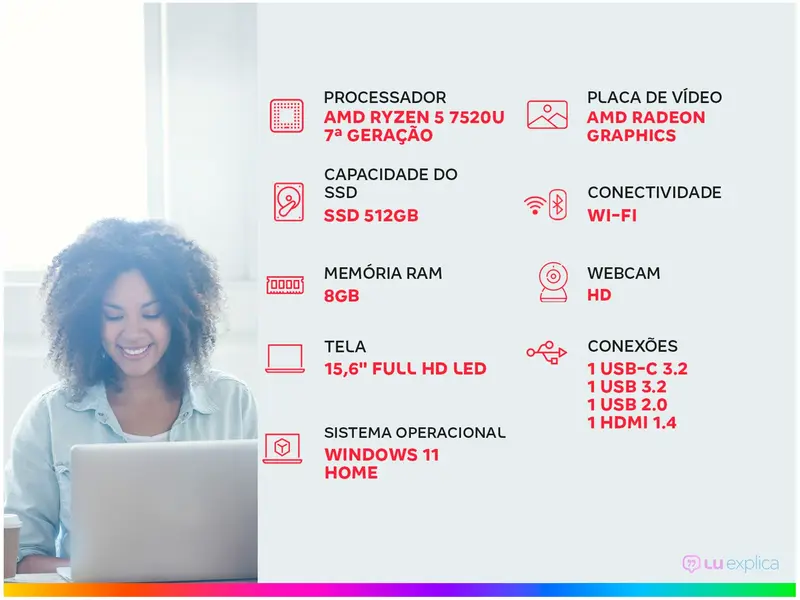 Equipado com processador AMD Ryzen 5 7520U de 7ª geração de excelente desempenho, 8GB de memória RAM e 512GB de SSD , ele é perfeito para seu dia a dia.