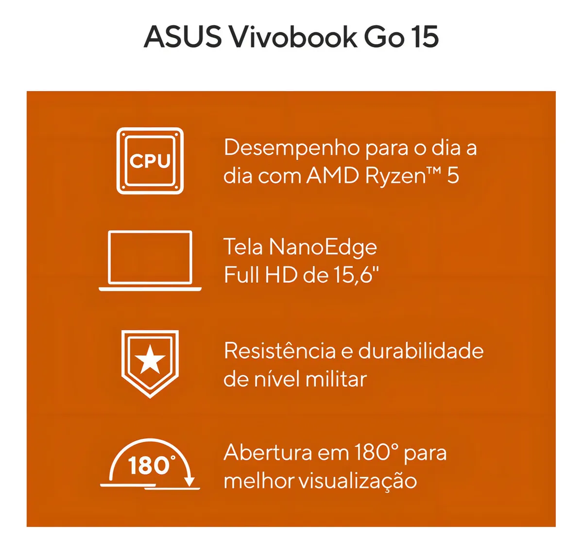 Notebook ASUS Vivobook Go E1504FA AMD Ryzen 5 7520U 8GB Ram 256GB SSD Tela 15,6" FHD Black - NJ825W. É leve e compacto, projetado para torná-lo produtivo e mantê-lo entretido onde quer que você vá! Com processador AMD Ryzen 5 7520U de excelente desempenho, 8GB de memória RAM LPDDR51 e 256 GB de SSD2, é perfeito para seu dia a dia. Ainda conta com uma dobradiça plana de 180°, tampa física protetora na webcam e muitos recursos de design bem pensados — incluindo uma tela de 15 polegadas antirreflexo Full HD.
