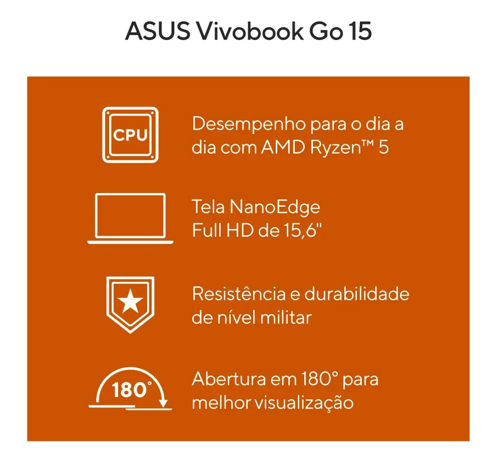 É leve. É compacto. É o ASUS Vivobook Go 15. Projetado para torná-lo produtivo e mantê-lo entretido onde quer que você vá! Com processador AMD Ryzen 5 7520U de excelente desempenho, 8GB de memória RAM LPDDR51 e até 512 GB de SSD2 , ele é perfeito para seu dia a dia. Ainda conta com uma dobradiça plana de 180°, tampa física protetora na webcam e muitos recursos de design bem pensados — incluindo uma tela de 15 polegadas antirreflexo Full HD — tudo para que você vá além!