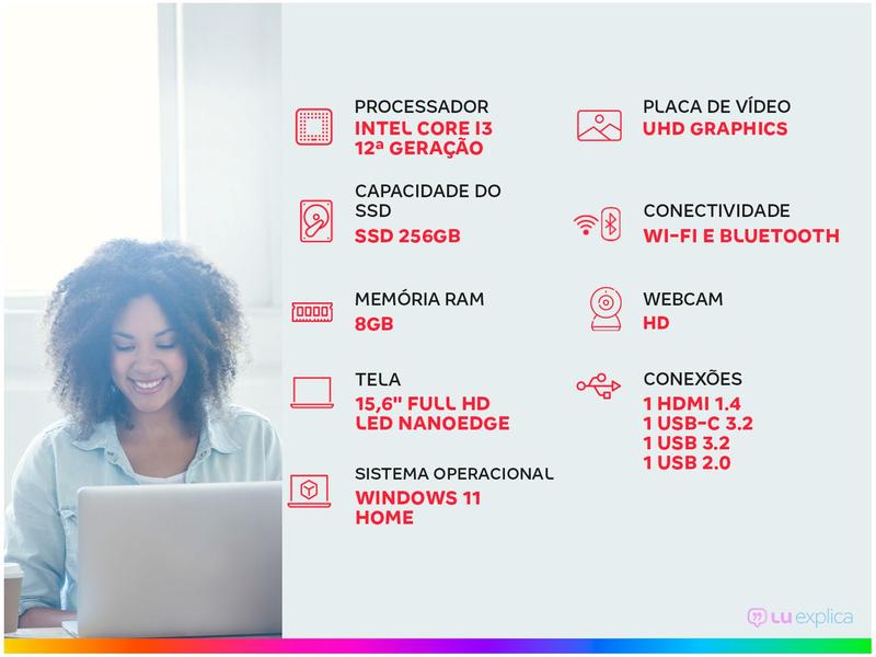 Ainda conta com 8GB de memória RAM, armazenamento SSD de 256GB e sistema operacional Windows 11.