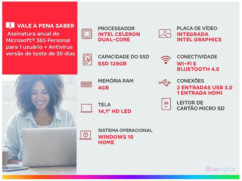 O Notebook Positivo Motion Gray C4128E é um produto desenvolvido para oferecer a você o melhor desempenho para suas tarefas cotidianas. Sua configuração traz processador Intel Celeron Dual-Core, 4GB de memória RAM e SSD de 128GB, para executar todas as tarefas do seu dia a dia, como acessar a internet, estudar e edições de texto muito mais. Seu design é leve, compacto e moderno e conta com tela LED de 14,1" com resolução HD, oferecendo imagens nítidas e cores vivas. As portas USB e HDMI, conectividade Wi-Fi e bluetooth. O teclado é um dos grandes destaques deste modelo pois traz recursos exclusivos como teclas de acesso rápido a Netflix, Deezer e Youtube, tecla call que abre seu programa de preferência para entrar em uma chamada de vídeo, além de uma leve inclinação para uma digitação mais ergonômica. Aproveite também o sistema operacional Windows 10 Home, super fácil, seguro e intuitivo.