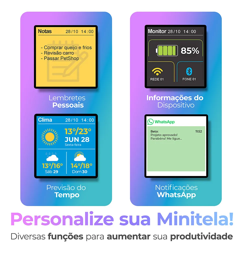 • Minitela integrada para lembretes, notificações do WhatsApp, mensagens, previsão do tempo, imagens, GIFs animados e atalhos;