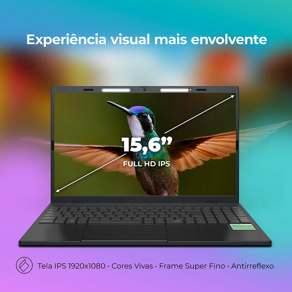 A tela de 15,6” com tecnologia IPS FHD antirreflexo entrega imagens nítidas mesmo sob iluminação intensa. A webcam HD com a tecnologia Lumina Bar, barras de LED com ajuste de 3 níveis de intensidade que proporcionam uma iluminação ideal para a captação de imagem da webcam, otimizando chamadas de vídeo auxiliando no uso do teclado em ambientes com pouca iluminação.