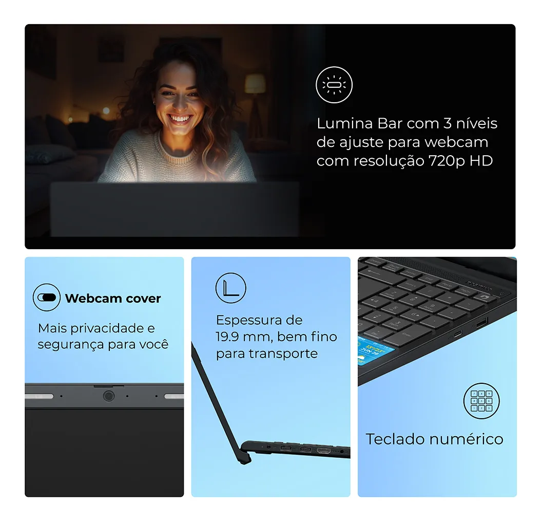A tela de 15,6” com tecnologia IPS FHD antirreflexo entrega imagens nítidas mesmo sob iluminação intensa. A webcam HD com a tecnologia Lumina Bar, barras de LED com ajuste de 3 níveis de intensidade que proporcionam uma iluminação ideal para a captação de imagem da webcam, otimizando chamadas de vídeo auxiliando no uso do teclado em ambientes com pouca iluminação.