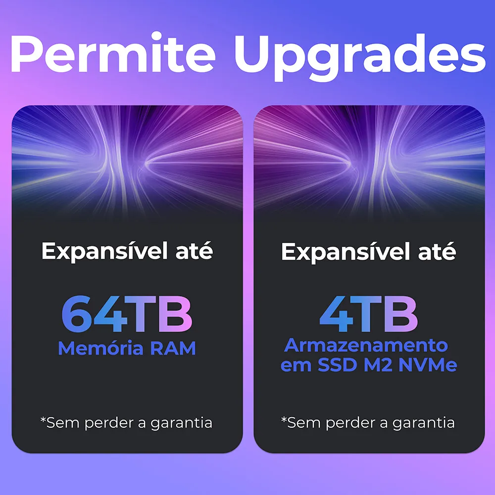 Se você busca um notebook que evolui com você, o Vision R15M permite upgrade de memória RAM até 64GB e até 4TB de SSD sem perder a garantia. Ou seja: você pode ampliar facilmente seu notebook conforme suas necessidades crescem, garantindo mais velocidade, espaço e longevidade ao equipamento.