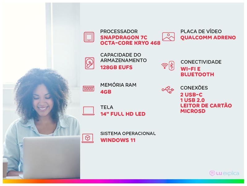 Ele é equipado com processador Snapdragon 7c de 2ª geração que oferece experiências de smartphone no PC com resposta instantânea, 4GB de RAM, armazenamento de 128GB eUFS e sistema operacional Windows 11.