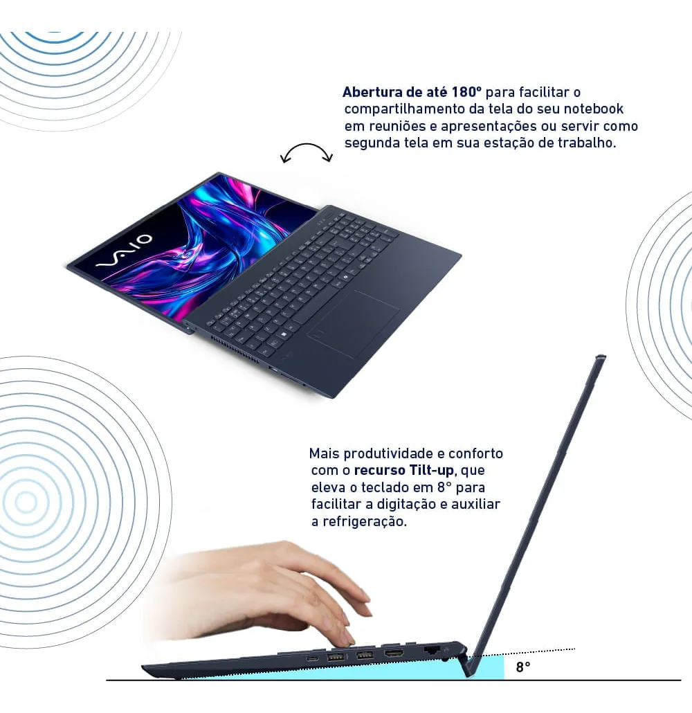 Com portas de conexão modernas, como USB 3.2 Gen 1 e USB tipo C, o VAIO FE16 garante compatibilidade com diversos dispositivos, aumentando sua versatilidade no trabalho ou lazer. Além disso, o software VAIO Câmera Inteligente eleva suas videoconferências a um novo nível: com desfoque de fundo, ajuste de iluminação automática e funcionalidades como auto mudo e foco suave, suas chamadas de vídeo serão mais profissionais e eficientes, sem distrações indesejadas.