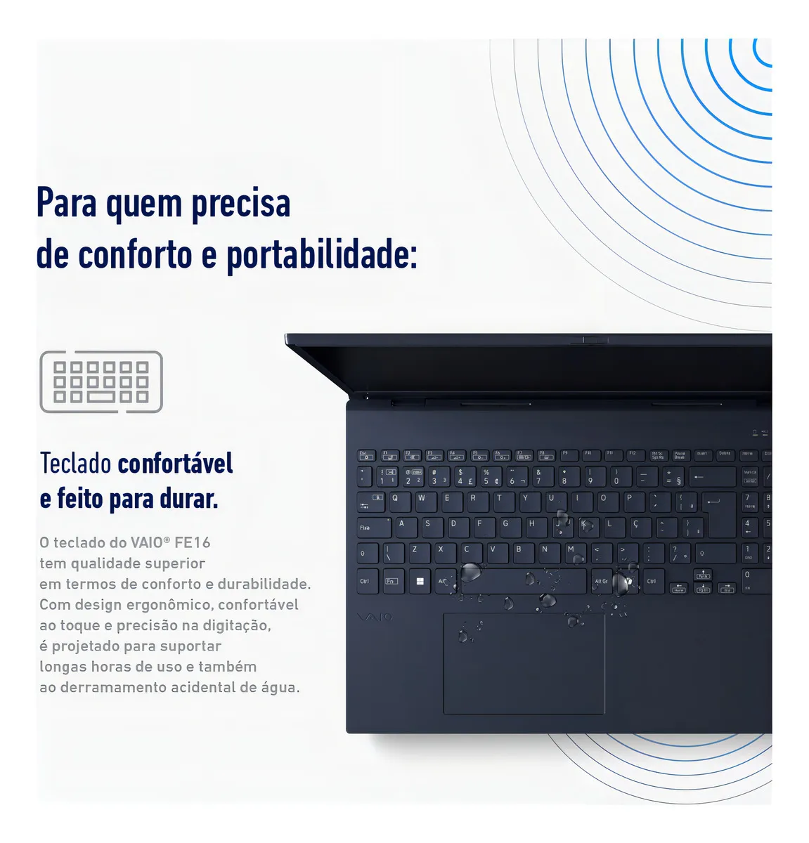 O design leve e sofisticado do VAIO FE16 facilita o transporte, com peso de apenas 1,85 kg e espessura de 19,8 mm. O teclado Comfort Key, resistente a derramamentos e com teclas maiores, assegura conforto durante a digitação, enquanto a tecnologia Ergo Lift eleva o teclado para otimizar a ergonomia e melhorar a refrigeração do sistema.