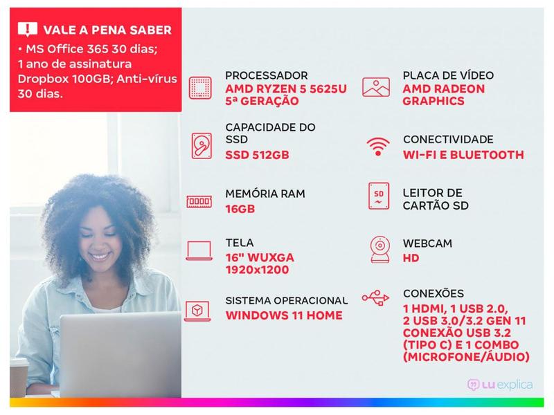 Equipado com processador AMD Ryzen 5 5625U de 5ª geração, proporciona performance poderosa, sendo ideal tanto para tarefas rotineiras quanto para aplicações mais exigentes, como edição de vídeos e design. Ainda conta com 16GB de memória RAM, armazenamento SSD de 512GB e sistema operacional Windows 11.