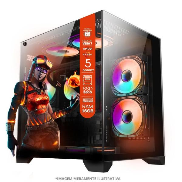 MARCA: TOB COMPUTERS EAN: 7898724984286 ESPECIFICAÇÕES TÉCNICAS: PROCESSADOR - Marca: AMD - Série: Ryzen 5 - Modelo: 5600GT - Núcleos: 6 - Threads: 12 - Clock: 3.6Ghz - Plataforma: AM4 PLACA MÃE - Chipset: AMD A520 - Plataforma: AM4 - Conexões de vídeo: VGA e HDMI - Slot de expansão para placa de vídeo: PCI-e x16 3.0 - Slot de expansão para placas diversas: PCI-e x1 - Slot de expansão para armazenamento: M.2 NVMe - Portas SATA para expansão de armazenamento - Conexões USB: 4x 3.2 e 2x 2.0 - Rede: Gigabit LAN - Áudio: Realtek 6 Canais Áudio alta definição HD (5.1 Canais) - Máximo de memória: 2x ddr4 com suporte para até 32gb 3200/2666/2400/2133/1600 mhz PLACA DE VÍDEO INTEGRADA AO PROCESSADOR - Marca: Radeon Graphics - Modelo: VEGA 7 - Tipo: Integrada - Núcleos: 7 - Frequência: 1900Mhz MEMÓRIA - Tipo: RAM - Geração: DDR4 - Frequência: 2666Mhz - Capacidade instalada: 16GB ARMAZENAMENTO - Tipo: SSD - Capacidade: 960GB GABINETE - Tipo: Gamer Aquário - Painel e vidro lateral temperado 3mm - Filtro anti-poeira superior magnético - HD Áudio - Placa-mãe compatível: Micro ATX e ITX