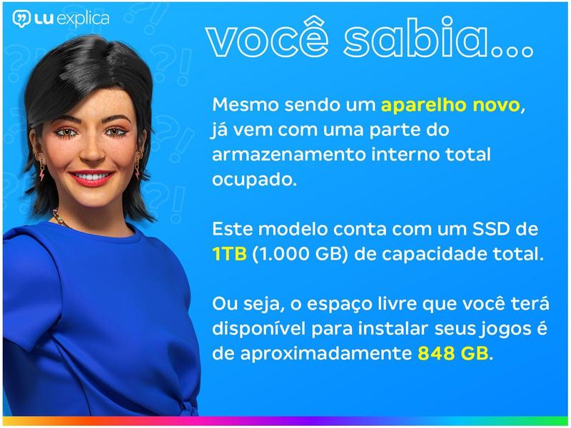 Espaço Livre Disponível: Aproximadamente 848 GB (parte da memória é reservada para o sistema operacional e arquivos essenciais do console).