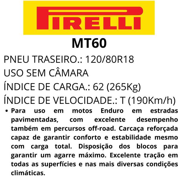 Pneu Moto 120 80 R18 MT60 Traseiro TL 62T Pirelli