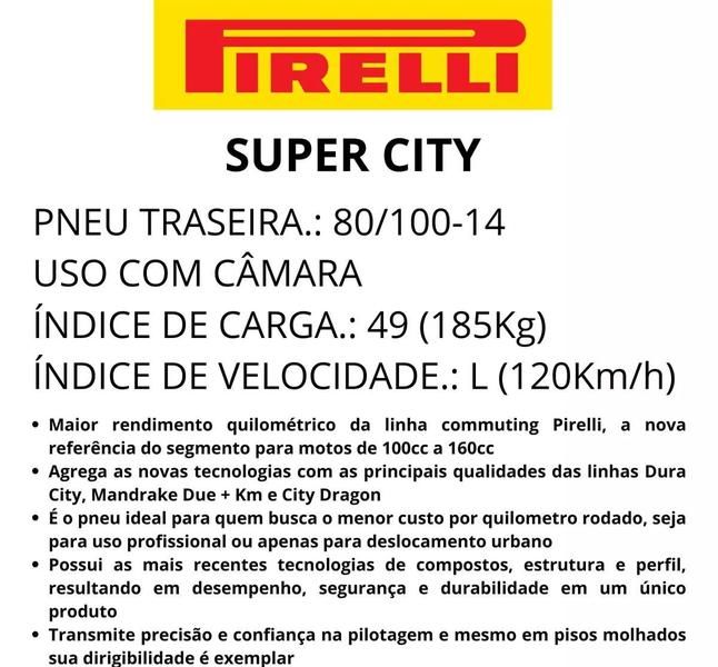 - Altura do Pneu100Aro14Instalação do PneuÉ necessário e indispensável instalar o pneu com um profissional especializado.Largura do Pneu80MarcaPirelliMedida80/100-14ModeloSuper CityPrazo de Garantia36 mesesTipo de CâmaraTTÍndice de Carga49Índice de Carga /
