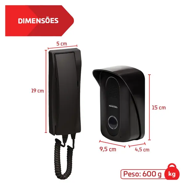 - Altura: 19,5 cm, Comprimento: 7 cm, Largura: 6,5 cm (Interfone)