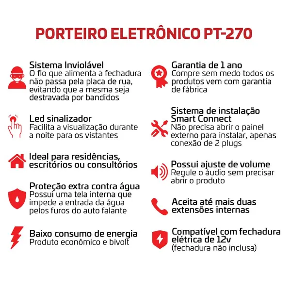O Porteiro Eletrônico PT-270 é de fácil instalação, utilizando um sistema de plugs, e conta com um botão para destravamento da fechadura e um LED sinalizador que ajuda a localizar o botão durante a noite.
