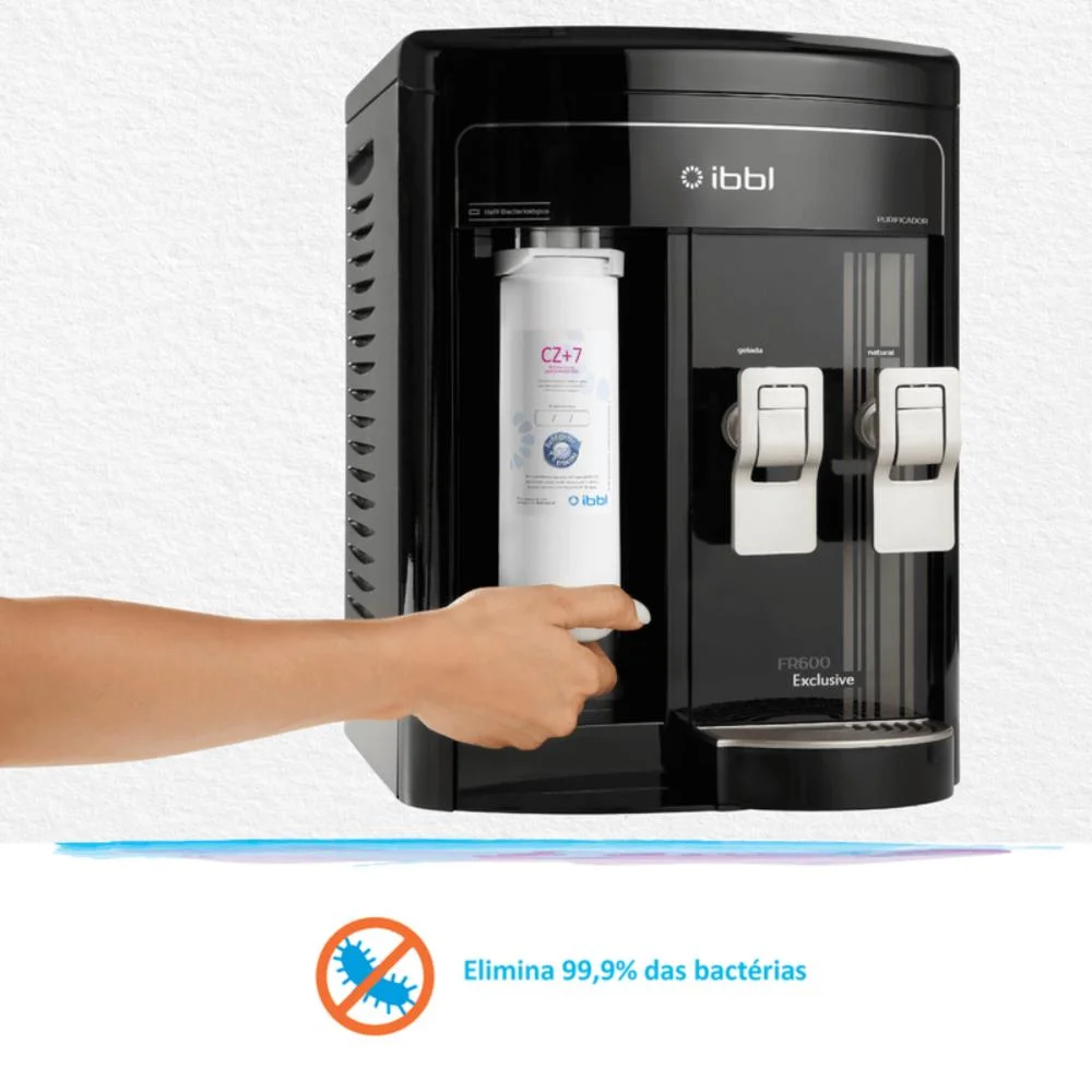 Confira porque o FR600 Exclusive é, perfeito para a sua casa ou empresa. Com á,gua natural e gelada, esse modelo IBBL é, a combinaç,ã,o perfeita de eficiê,ncia,praticidade, design e robustez. Ele possui Troca de Refil Inteligente, o led fica vermelho para avisar que o refil precisa ser trocado. Alé,m da eficiê,ncia bacterioló,gica, que garante mais seguranç,a para a famí,lia e os clientes, com á,gua pura e livre de bacté,rias.Caracterí,sticas:- Ecocompressor: com gá,s R134a que nã,o agride o meio ambiente- Á,gua filtrada sem energia- Refil Girou, Trocou: troque sem fechar o registro- Refil Bacteriostá,tico: controla a proliferaç,ã,o de bacté,rias- Elimina odores- Elimina sabores- Reté,m micropartí,culas presentes na á,gua- Easy Clean (desmontá,vel para higienizaç,ã,o)- Serpentina externa (fá,cil higienizaç,ã,o)- Nanotecnologia: inibe a proliferaç,ã,o de micro-organismos- Grande vazã,o: copo cheio em poucos segundos- Bandeja removí,vel: para esvaziar ou higienizar- Gabinete com proteç,ã,o UV- Ambientes internos e externos- Fixaç,ã,o na parede - Pé,s antiderrapantes- Boia de controle de ní,vel de á,gua