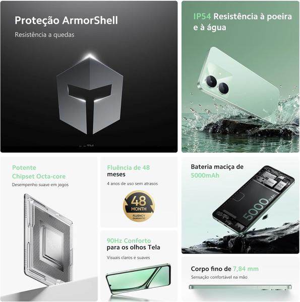 O Realme Note 60X é a combinação perfeita entre desempenho, economia e eficiência para o seu dia a dia. Equipado com o processador Unisoc T612 Octa-Core de 12nm, oferece fluidez e estabilidade nas tarefas cotidianas, garantindo agilidade na navegação, redes sociais e uso de aplicativos. Sua memória RAM de 4GB, com expansão dinâmica de até 8GB, aliada ao armazenamento interno de 64GB (expansível até 2TB via microSD), proporciona espaço e desempenho sob medida para o que você realmente precisa. A tela de 6,74 polegadas HD+ oferece uma experiência visual imersiva com taxa de atualização de 90Hz e amostragem de toque de até 180Hz, ideal para vídeos, jogos e rolagem suave nas redes sociais. A câmera traseira de 8MP possui recursos como modo retrato, modo noturno, panorama, lapso de tempo e até modo profissional, oferecendo liberdade criativa para suas fotos e vídeos. Já a câmera frontal de 5MP é perfeita para selfies e videochamadas com boa definição. Com bateria de 5000mAh, você pode usar o aparelho por horas sem preocupação, e o carregamento de 10W com porta USB-C garante praticidade na hora de recarregar. O Realme Note 60X também entrega excelente conectividade, com suporte ao 4G Dual SIM, Wi-Fi 5GHz, Bluetooth 5.0 (SBC, AAC e LDAC) e GPS completo com AGPS, GLONASS, BDS e Galileo. Completo em funcionalidades, o modelo ainda traz entrada P2 para fones de ouvido, interface realme baseada no Android 14, sensor de proximidade, luz, aceleração e magnético, além de design moderno, fino (apenas 7,84mm) e leve (187g). Ideal para quem busca um smartphone confiável, equilibrado e acessível para o uso diário, o Realme Note 60X 64GB Global 3GB Preto 4G é a escolha certa em performance, estilo e autonomia.