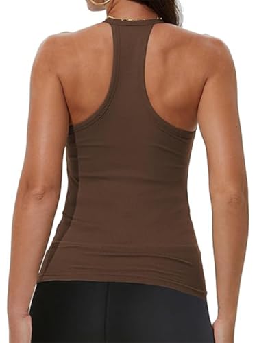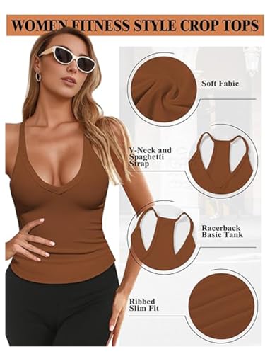 Regata Esportiva Feminina, Sem Mangas, Decote em V, Fina, Canelada, Casual, Moderna, Alças Finas, para o Verão, Marrom, M