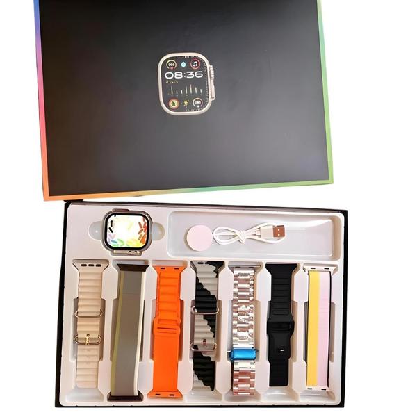 - 1 Relógio Ultra Serie 9, 2 Pulseira Oceano, 2 Pulseira Silicone, 1 Pulseira Bege Premium, 1 Pulseira Metal, 1 Pulseira Couro, 1 Case Protetora, 1 Cabo sem fio do carregador, 1 Caixa Original