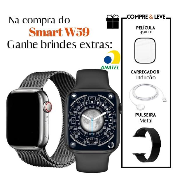 - 1 Smartwatch W59 Pro Serie 9 de 47mm, 1 Pulseira de Silicone, 1 Pulseira Metal Milanesa, 1 Cabo de carregador por indução Wireless, 1 Manual do Usuário, 1 linda caixa para armazenamento dos itens., 1 Pelicula