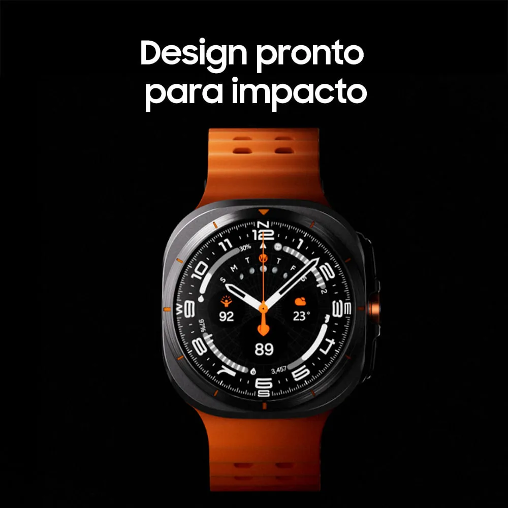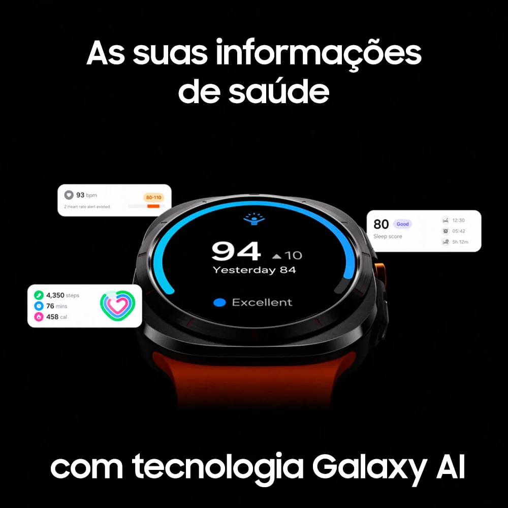 Construído para ultrapassar os limites, o Galaxy Watch Ultra resiste a até 55 °C de calor, 9.000 m de altitude e 10 ATM de pressão da água, suportando tudo isso sem problemas com sua nova estrutura em titânio aeroespacial e vidro em cristal de safira. O novo processador de 3nm potencializa sua rotina diária. Alterne rapidamente entre verificar o clima e monitorar seus treinos em um instante. Além disso, ele otimiza a vida útil da bateria para uma energia de longa duração, garantindo que o seu Galaxy Ultra acompanhe o seu ritmo. Seja escalando penhascos ou fazendo trilha por dias, ultrapasse os limites sem se preocupar com a recarga durando até 100 horas no modo Economia de energia. Fique à frente na sua jornada de bem-estar com o nosso sensor de saúde mais avançado no Galaxy Watch.