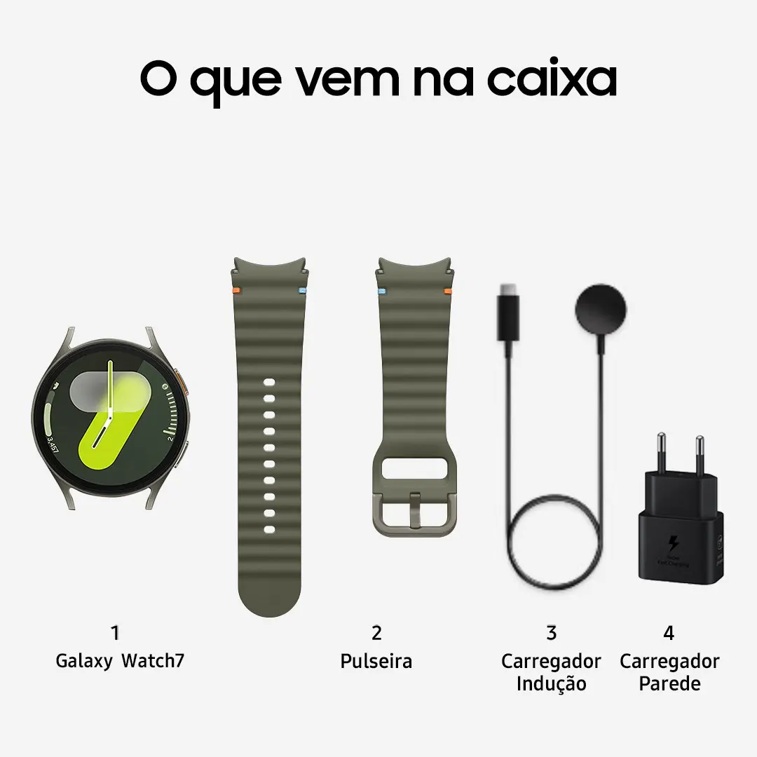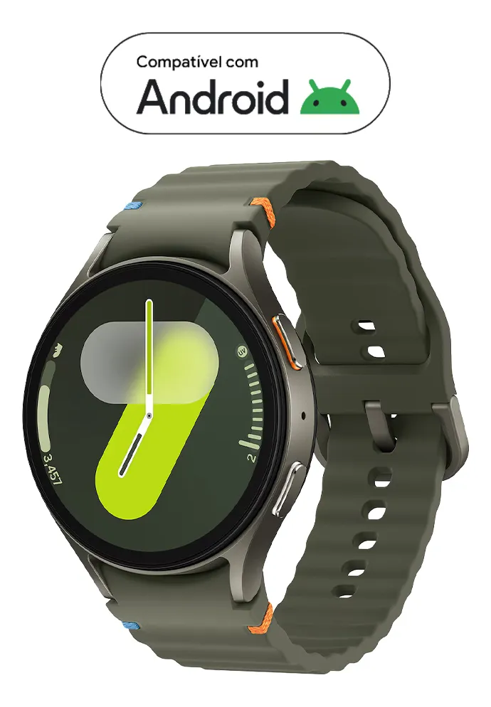 Eleve seu estilo com o Galaxy Watch7. Um design com vidro flutuante e pontos de costura coloridos adicionam um toque de elegância ao seu pulso, enquanto ondulações na pulseira mostram que você está pronto para os exercícios. O relógio está disponível em tamanho pequeno ou grande com três opções de cores: Verde, Prata e Creme. O novo processador de 3nm potencializa sua rotina diária. Alterne rapidamente entre verificar o clima e monitorar seus treinos em um instante. Além disso, ele otimiza a vida útil da bateria para uma energia de longa duração, garantindo que o seu Galaxy Watch7 acompanhe o seu ritmo. Encontre o seu caminho com facilidade com o GPS mais preciso de todos os tempos no Galaxy Watch. O GPS de frequência dupla usa duas bandas de sinal de satélite (L1+L5), garantindo rastreamento preciso e consistente, mesmo em meio a densos blocos urbanos. Fique à frente na sua jornada de bem-estar com o nosso sensor de saúde mais avançado no Galaxy Watch. Com 13 LEDs, o novo BioActive Sensor monitora sua frequência cardíaca, padrões de sono e muito mais com alta precisão. Entenda melhor seu corpo e comece seu dia de forma mais inteligente com a Pontuação de Energia. Verifique seu sono, frequência cardíaca e atividades diárias e planeje sua rotina todos os dias. Não descansou tão bem? Talvez seja melhor pular a academia e relaxar em casa para voltar aos trilhos. Leve o seu treino para o próximo nível com o Galaxy Watch7. Crie sua rotina de exercícios perfeita com aquecimentos, relaxamentos e intervalos, ou compita contra seus recordes anteriores para se manter motivado. Acompanhe seus treinos facilmente, mesmo na água, com o modo Bloqueio de água. Mantenha sua tranquilidade com um pacote de monitoramento cardíaco. O sensor de fotopletismografia (PPG) integrado no seu Galaxy Watch7 monitora sua frequência e ritmo cardíacos. Se ele detectar irregularidades na frequência ou nos ritmos cardíacos, ele envia uma notificação com um aviso para fazer um ECG para avaliar seu ritmo cardíaco mais detalhadamente. Além de aferição da Pressão Arterial homologada pela Anvisa. Se suas mãos estiverem ocupadas e alguém ligar, basta pinçar seus dedos duas vezes para atender. Um simples gesto é tudo o que você precisa para tirar uma foto, atender uma chamada ou desligar um alarme.