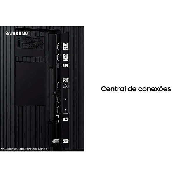 - Anynet+ (HDMI-CEC), HDMI: 3, HDMI Maximum Input Rate: 4K 120Hz (para HDMI 1/2/3), USB: 2 USB-A, Ethernet (LAN), Saída de Áudio Digital (Óptica): 1, Entrada de RF (terrestre/entrada de cabo): 1/1 (Uso Normal para o Terrestre)