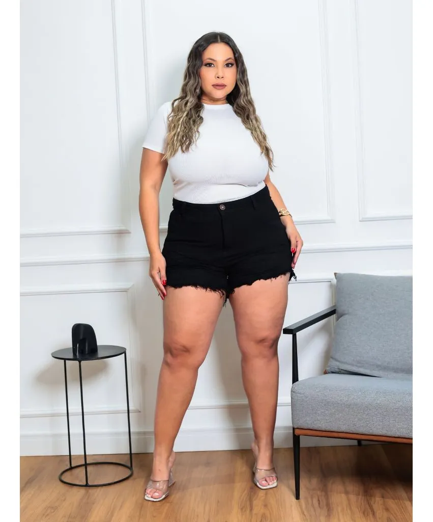 Short Feminino Plus Size Jeans Preto Enrugado Cintura Alta