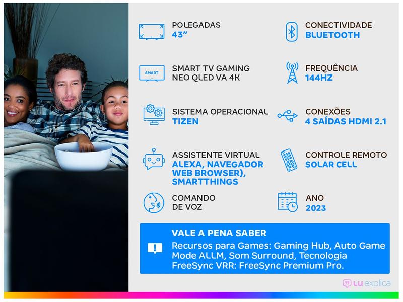 - Gaming Hub, Auto Game Mode ALLM, HGiG, Game Motion Plus, Dynamic Black EQ, Som Surround, Tela Super Ultra Wide e Menu de Jogo, Zoom do Minimapa, Tecnologia FreeSync VRR: FreeSync Premium Pro