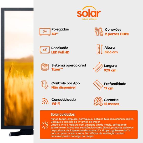 A Smart TV Samsung 43T5300A de 43" é a escolha ideal para quem busca uma TV com excelente qualidade de imagem e recursos avançados. Com resolução Full HD (1920x1080), 60Hz de frequência e tecnologia LED, ela oferece imagens nítidas e vibrantes, além de um amplo ângulo de visão para você assistir seus programas favoritos de qualquer lugar da sala.