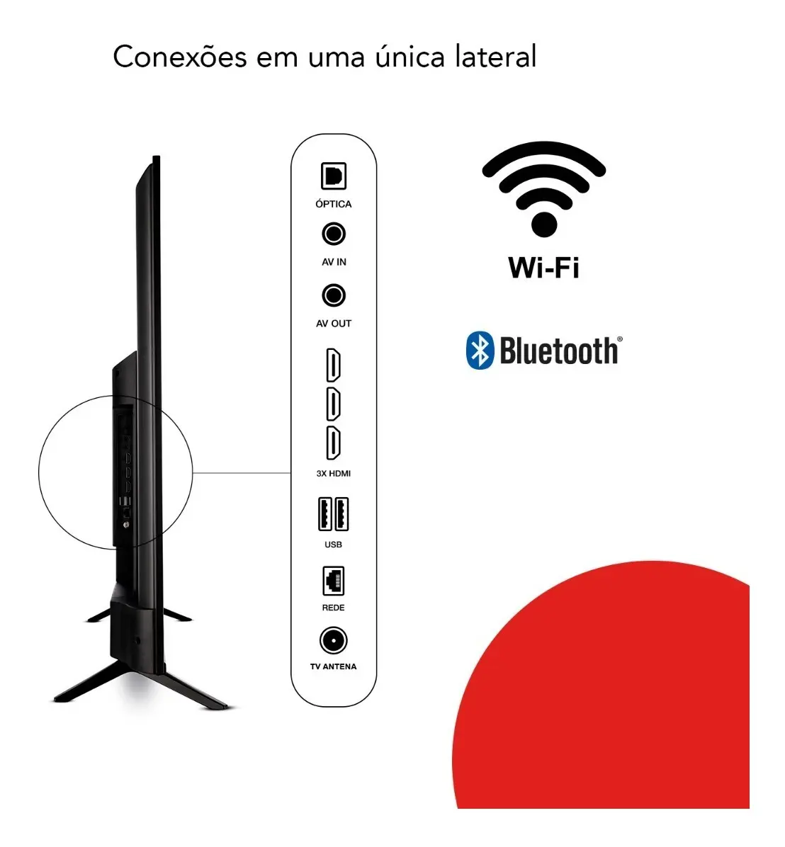 BLUETOOTH: Com o Bluetooth, você potencializa sua experiência sonora através do pareamento da televisão com dispositivos de som como Speakers, fone de ouvido, Home Theater e Sound Bar.
