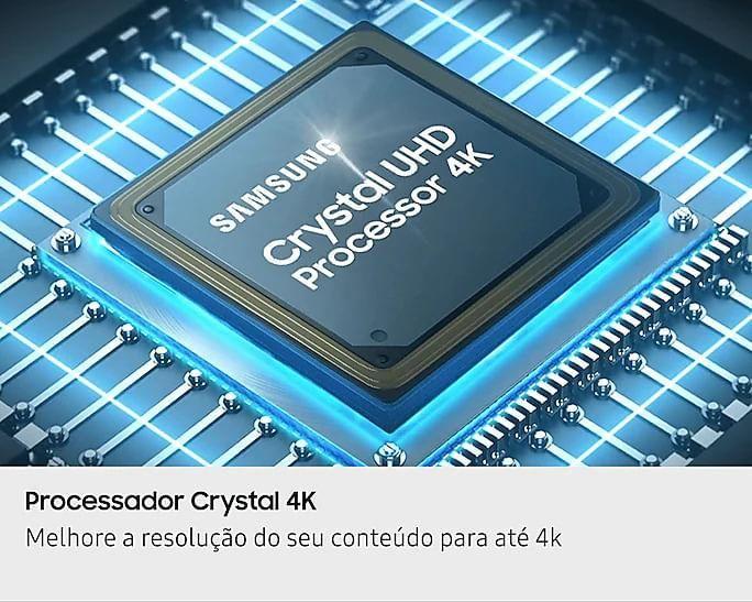 - Processador Crystal 4K, Resolução 4K, Central de Segurança Knox, Samsung TV Plus e Gaming Hub